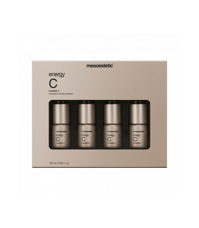 Energy C Complex es un tratamiento intensivo antioxidante con vitamina C al 10 % formulado para recuperar la luminosidad y firmeza de la piel. Se presenta como un protocolo de 4 semanas que combate el fotoenvejecimiento, las líneas finas y la pérdida de elasticidad cutánea, reforzando las defensas naturales ante los radicales libres.