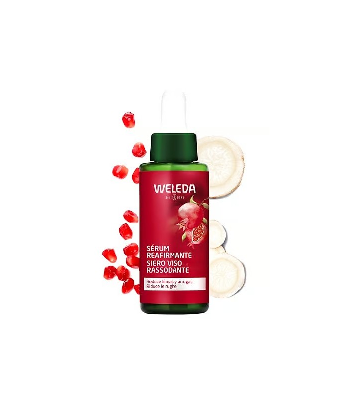 El aceite de semillas de granada orgánica y los péptidos de la raíz de maca orgánica activan eficazmente la renovación celular. La piel se siente fresca y firme. Mejora la elasticidad de la piel. Sérum Reafirmante de Granada y Péptidos de Maca 30ml. Información del fabricante: Weleda AG, 73525 Schwäbisch Gmünd, Germany, www.weleda.com