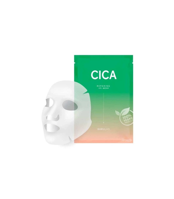 Esta mascarilla de tejido reparadora con cica es 100% vegana, - ¿sabías que Barulab cuenta con un montón de mascarillas veganas que podrás encontar en MiiN? The Clean Vegan Mask - Cica es ideal para piel sensible, pero si lo que te preocupa es aliviar la sequedad del rostro, prueba su mascarilla hermana con aloe vera, ¡también vegana!